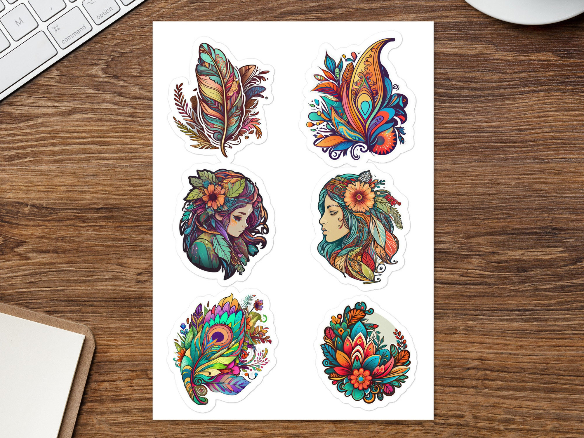 Bring some bohemian vibes to your life with these beautiful and colorful boho stickers! The Set includes 6 unique designs featuring whimsical and intricate patterns, dreamcatchers, feathers, and other bohemian-inspired elements. These stickers are perfect for decorating your planner, laptop, phone case, water bottle, or any other surface that needs a little bit of boho flair. The high-quality vinyl material ensures that these stickers are durable and long-lasting, while the vibrant colors make them stand out wherever you place them. Whether you're a boho babe or just appreciate the beauty of this style, these stickers are a must-have for your collection! Order yours today and let the boho magic begin.