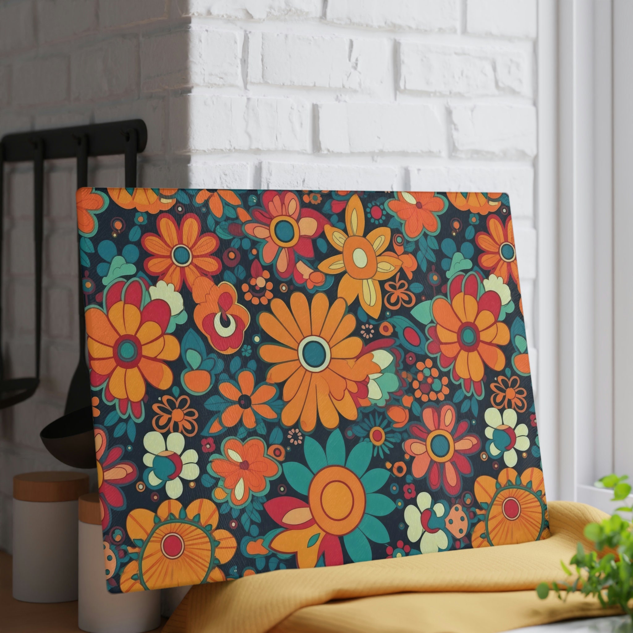 Introducing our vibrant 70s Hippie Flowers Glass Cutting Board, a perfect combination of practicality and style for your kitchen! This eye-catching cutting board features a colorful floral design reminiscent of the groovy 70s, guaranteed to add a splash of cheerfulness to your cooking space.