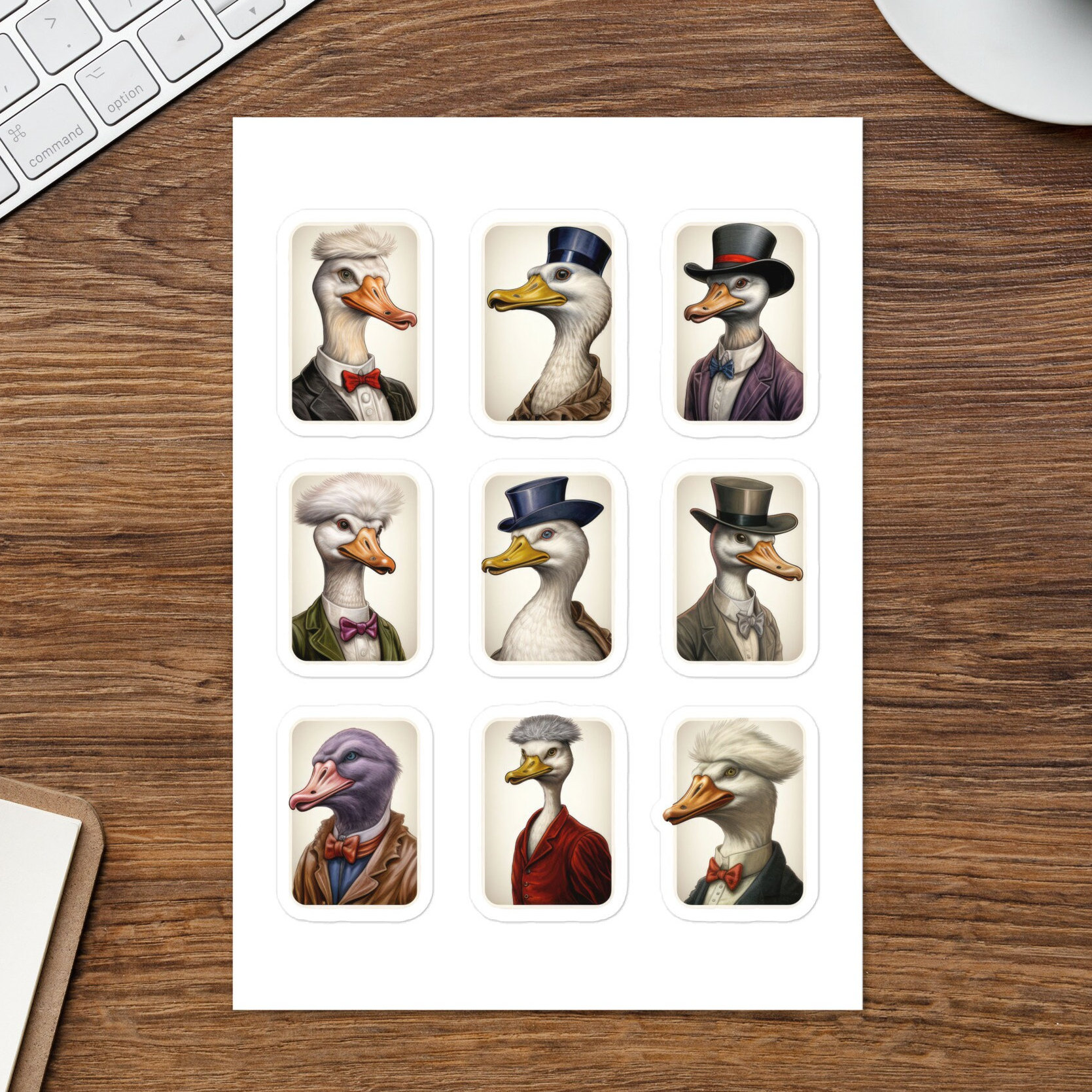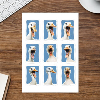 Our charming collection of nine goose-themed stickers brings whimsy and elegance to your personal belongings. Each sticker is a vignette of personality, from the genteel goose in a top hat to the nonchalant bird in a trench coat.