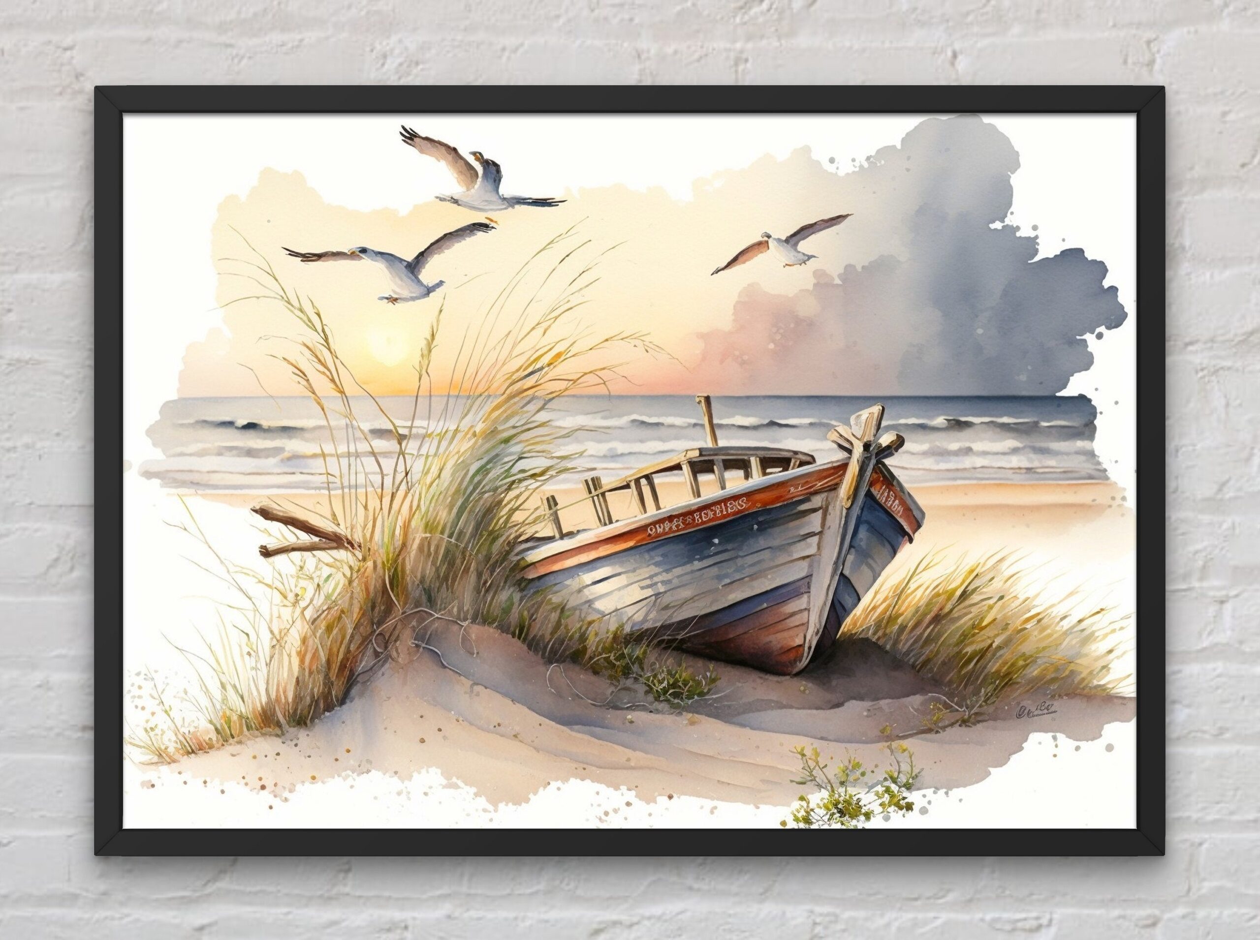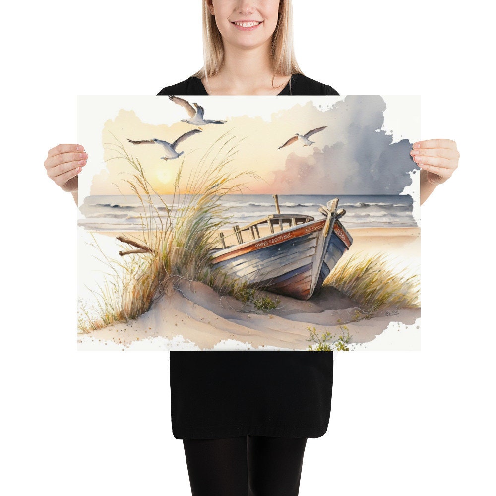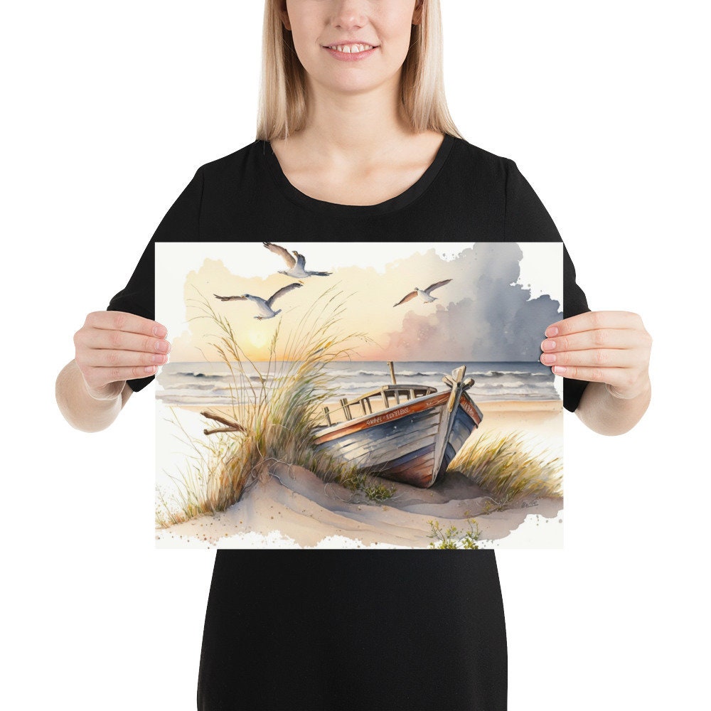 Bring the peacefulness of the beach to your home with our stunning digital wall art watercolor posters. Featuring serene images of sunrise on the shore with soaring seagulls and old boats, these posters are sure to create a tranquil atmosphere in any room. With rich, vibrant colors and intricate details, each poster is a masterpiece of art that you can enjoy every day. Upgrade your decor and transform your space with these beautiful wall art posters, available now on Etsy.
