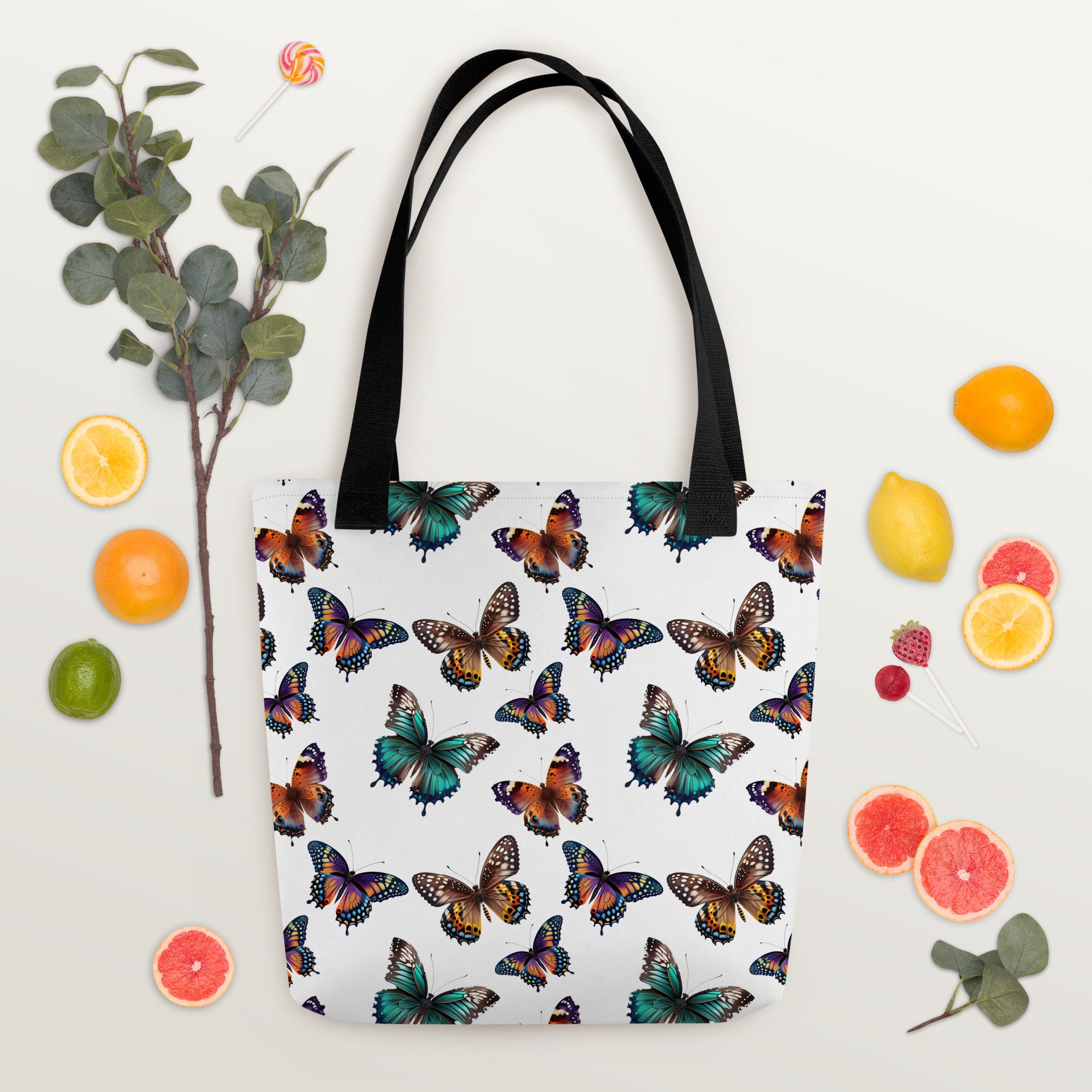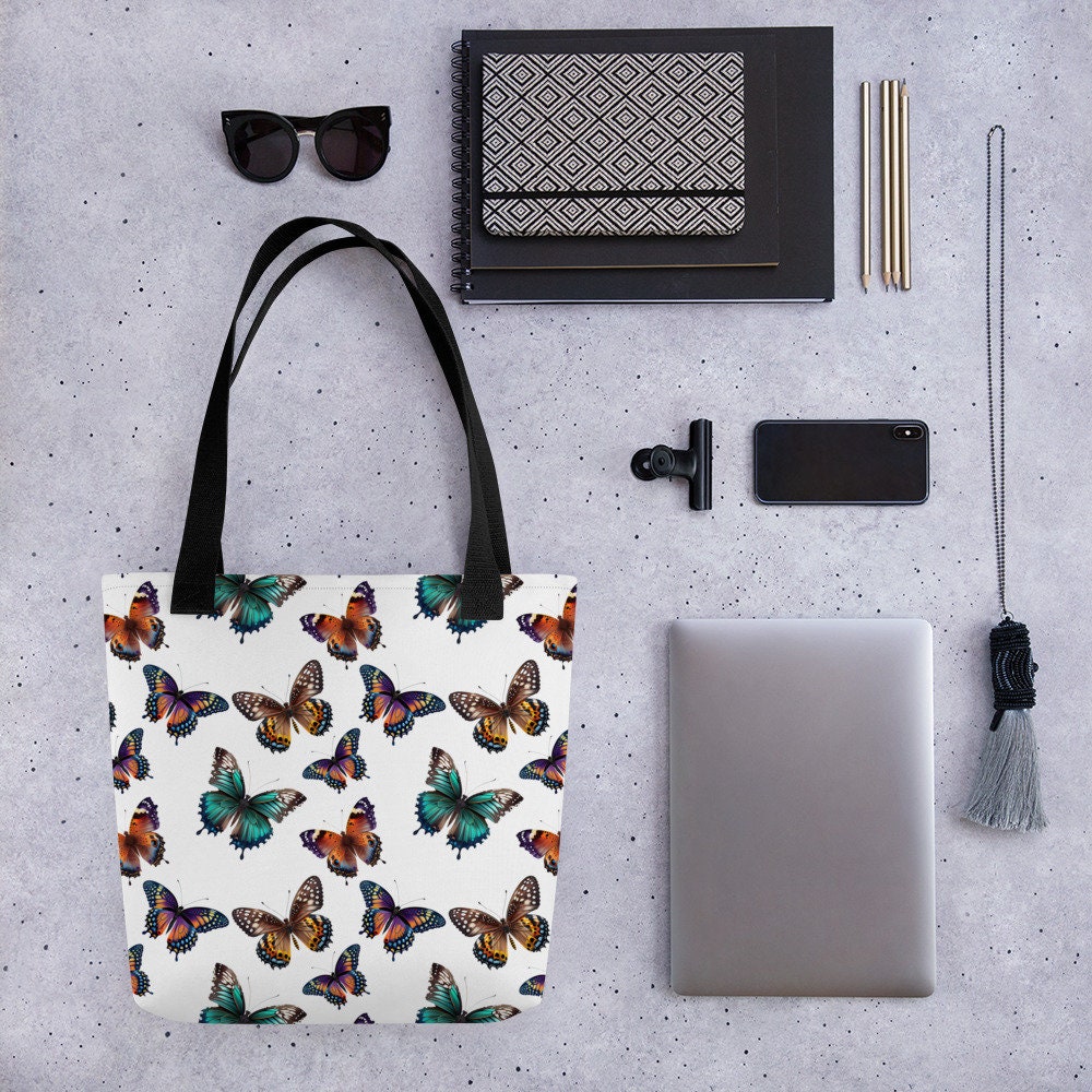 Take flight with this beautiful butterfly tote bag! With its intricate butterfly design in soft, pastel colors, this bag is the perfect accessory for anyone who loves nature and all its beauty. The spacious interior is perfect for carrying all your essentials and more, while the sturdy handles make it easy to take with you wherever you go. Whether you're headed to the grocery store, the beach, or simply out and about, this tote is the perfect combination of style and functionality. Handcrafted with care, it's an eco-friendly and sustainable choice that you'll feel good about using again and again. Bring a touch of whimsy to your everyday with this beautiful butterfly tote bag.
